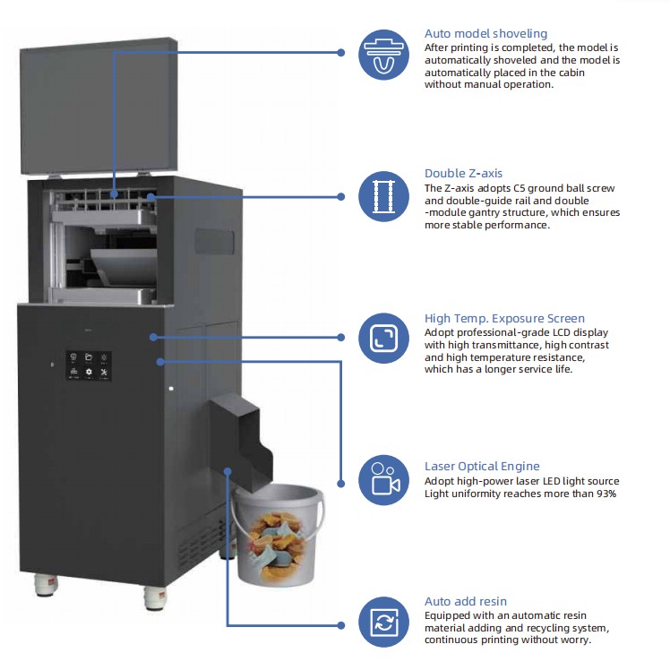After printing is completed, the model is automatically shoveled and the model is automatically placed in the cabin without manual operation.