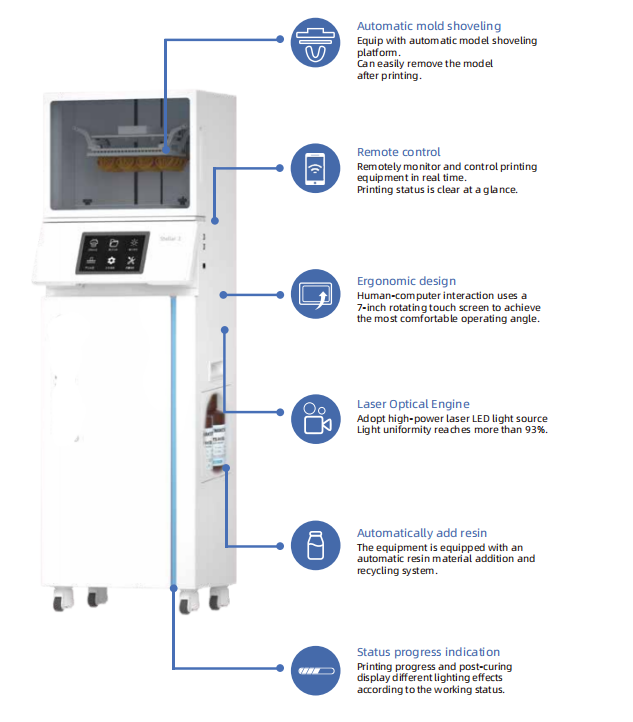 Built-in automatic constant temp,humidity control and resin odor filtration to keep the resin material in the